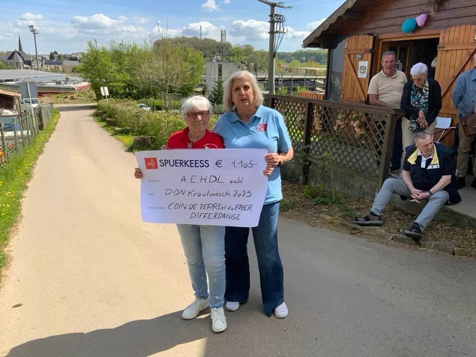A l'occasion de son assemblée générale au chalet Kondel de Differdange, le Coin de Terre et du Foyer de la Cité du Fer a remis un chèque substantiel de 1.105, € à Martine Biever-Rollinger, secrétaire-générale d'AEHDL.